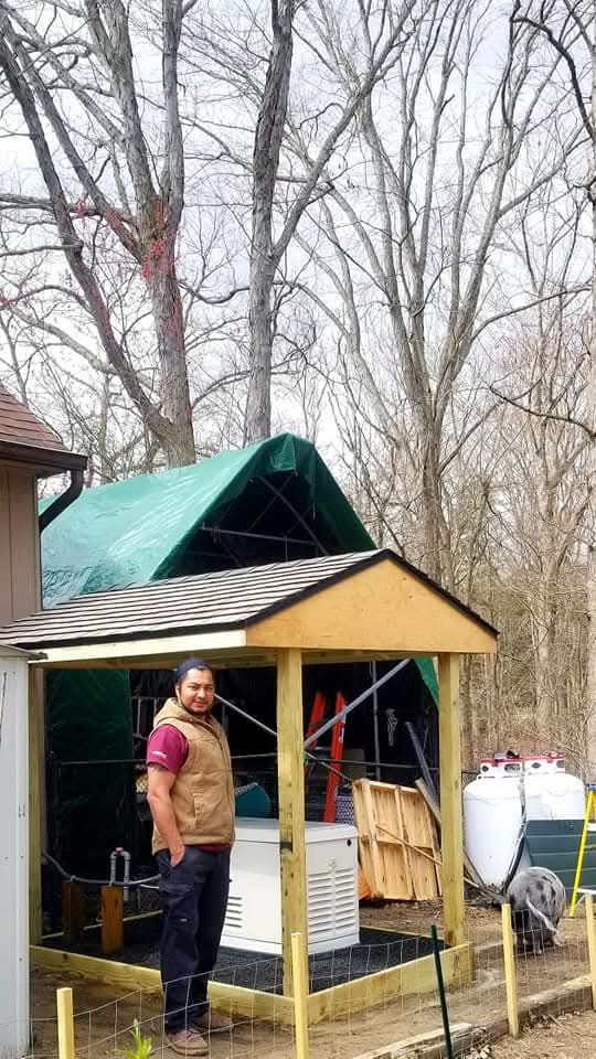 This project features images of a wooden deck with stairs leading to a lake, wooden steps leading down to a forested lake. Roof and structure created for a Generac generator all built and installed by QRC.